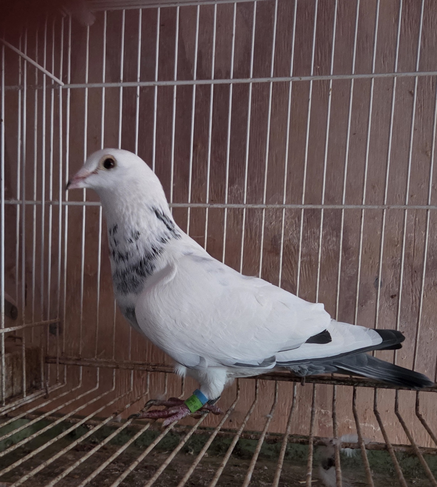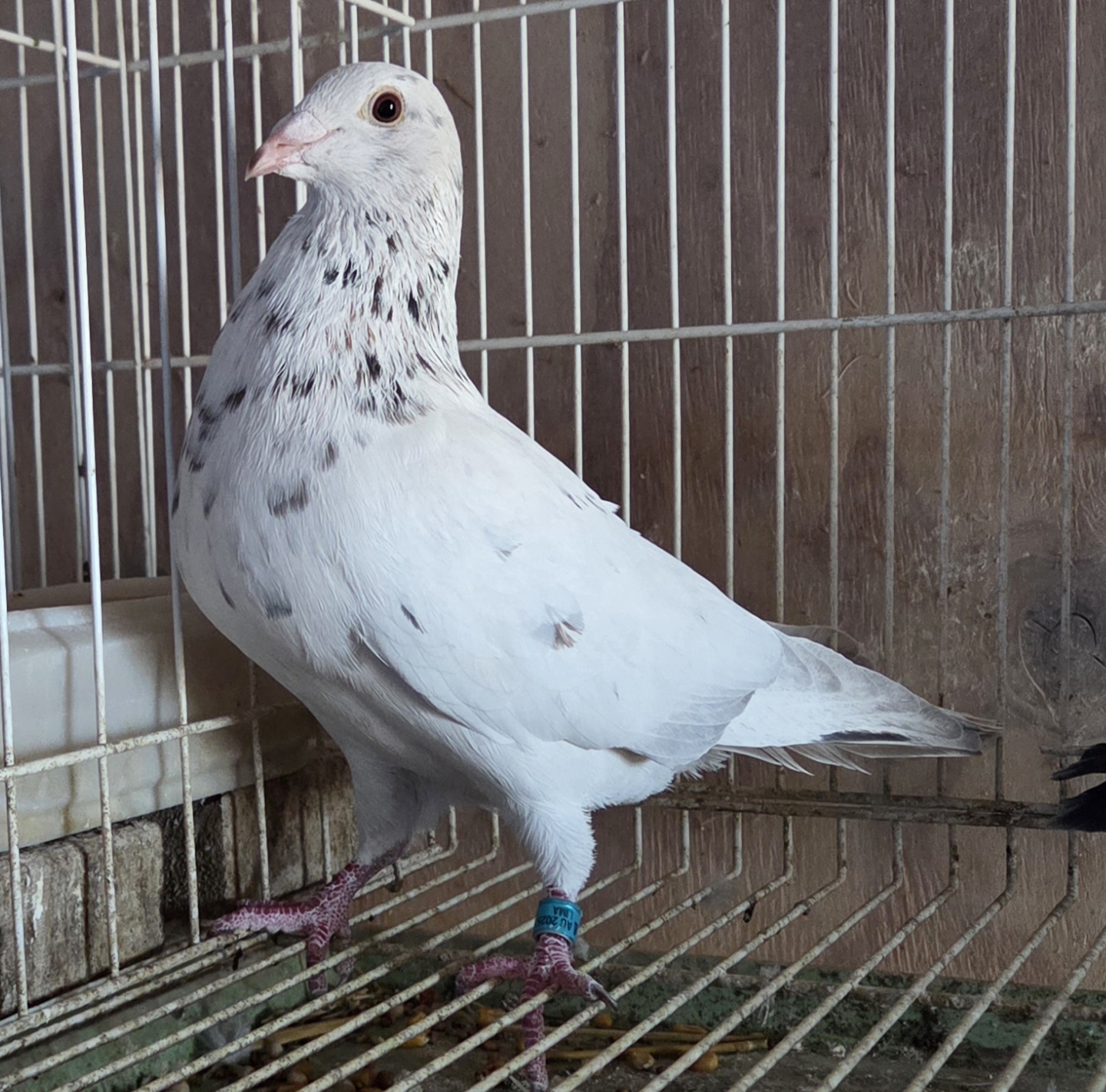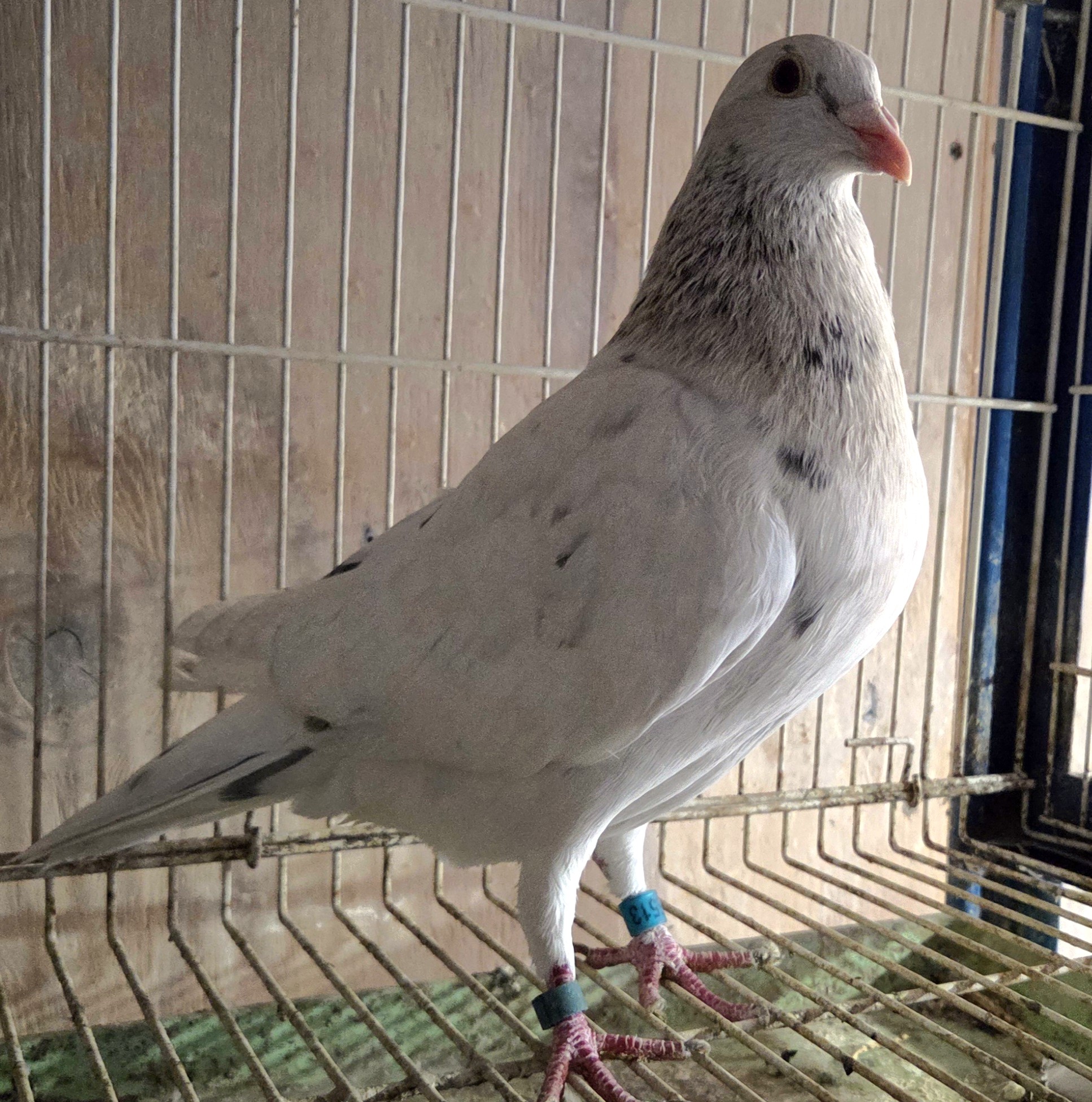 | 5. | May 2025 hatch white grizzle cock no. 5412. This is actually a homozygous (pure) grizzle which means all of his young will be some form of grizzle. He was weaned too late to put on the current YB team and was set aside in case I needed him for breeding. At this point it does not appear that I will need him since I will have both his parents. Both parents are on the current OB team. Sire has flown 4 races out to 200 miles and dam has flown twice from 100 and twice from 120. 5412 is a blend of Janssen, Delbar, HVR and Wegge. His paternal grandfather, a pure Wegge, has flown 20 races out to 350 miles. Fully pedigreed. Price reduced: $75. | ![]() |