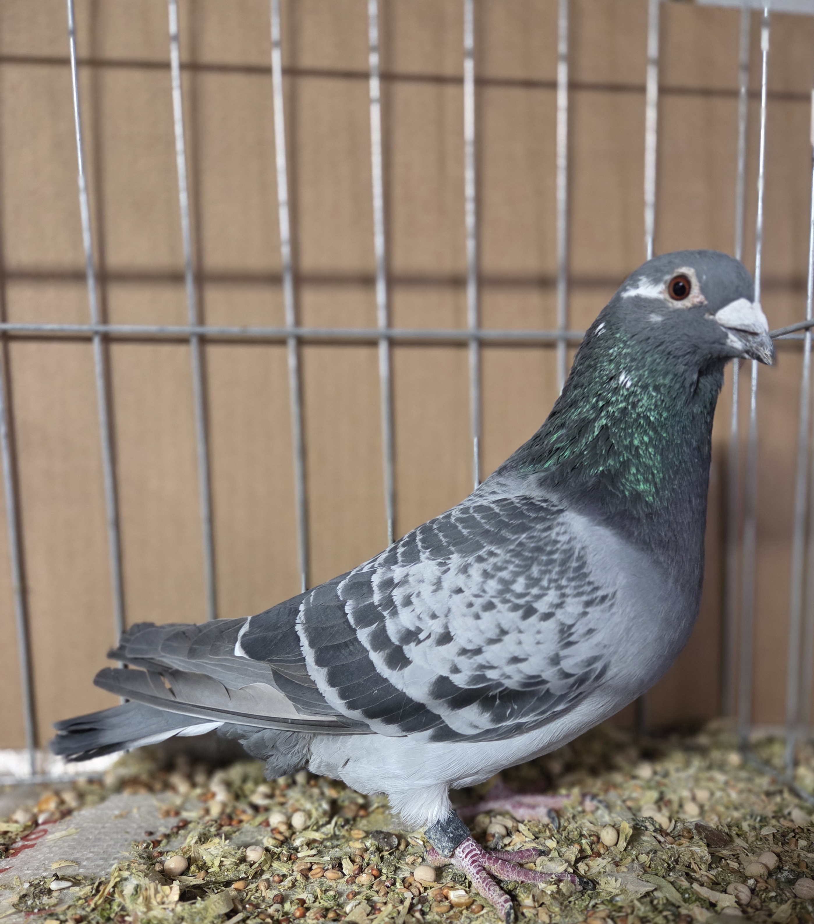 | 2. | 2023 grizzle cock no. 3676. This is the sire of the grizzle hen recently sold here. He is a member of my flying team and has flown a total of 8 races out to 200 miles. (We are a small independent club and at this point we don't fly anything past 300 miles due to the expense and some years we don't even get that far.). He has a 2nd-place finish at 120 miles and has also been very productive as a breeder. I need to make room in both my racing and breeding lofts, as well as to cut down on total numbers of birds because as I get older it becomes more of a chore each year. 3676 is out of a pair of "white grizzles", so it would be reasonable (but not a foregone conclusion) to assume he is a homozygous grizzle, which means all his offspring whould be grizzle. His pedigree includes the old-line Wegges, long-distance Delbar and Janssen on the sire's side; and mostly Janssen on dam's side with a bit of Hofkens. Sire's background includes an AU Registered Champion as well as siblings of AU Elite Champions. Price: $100 | ![]() |