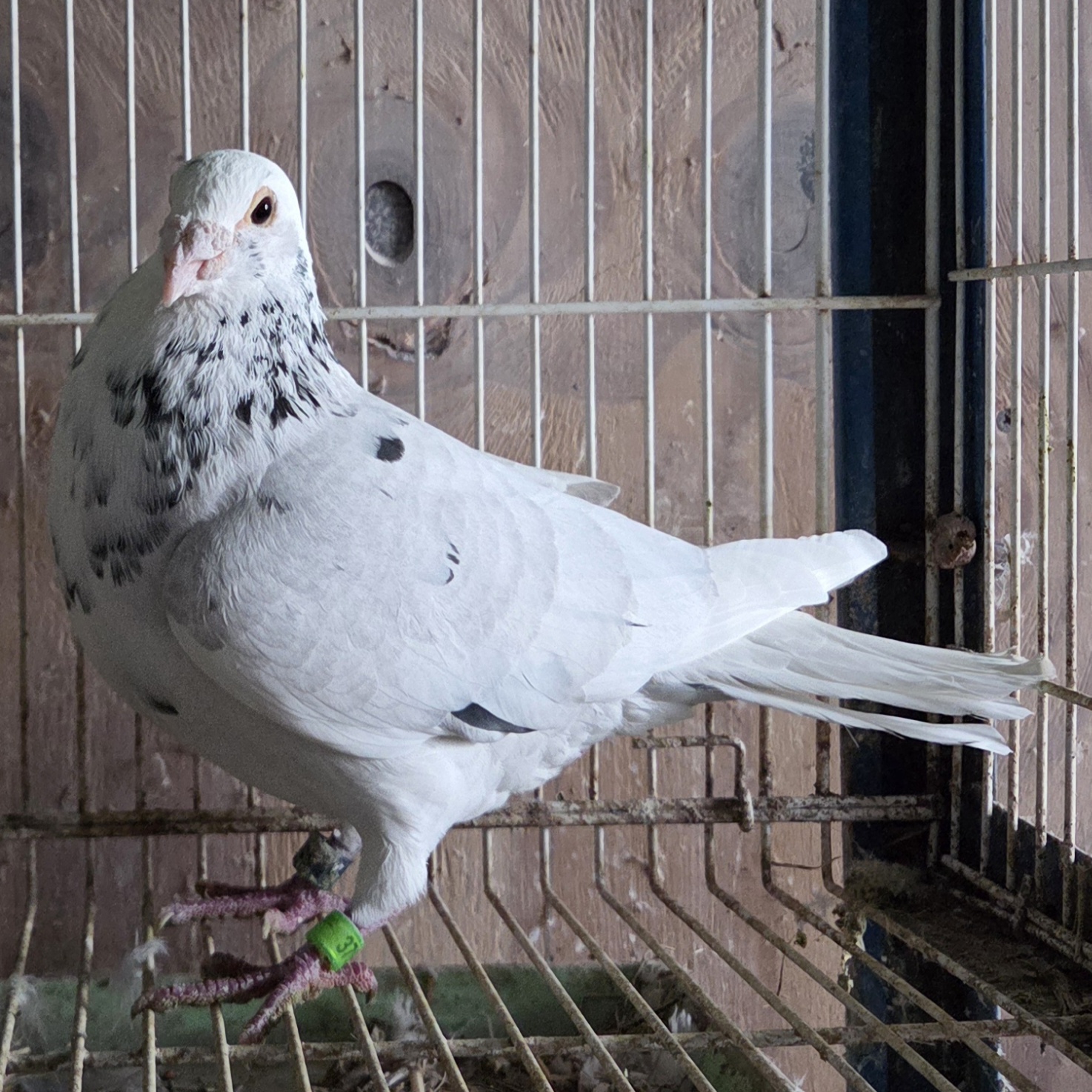 | 4. | SOLD 2024 white splash cock no. 672 out of a black/wf cock bred by Ken Christopher and a pied blue bar hen that I raised and sent to the Ohio Classic Race in 2018 where she placed 31st out of 204 and shared in the prize money for handler Tom Tomes of Ohio. Sire was down from Gallo loft and a black splash hen bred by Ken Weyer. Dam is primarily Janssen with a touch of the old-line long-distance Delbars. Limited pedigree on sire's side, full pedigree on dam's side. Price: $50 - SOLD (LL) |