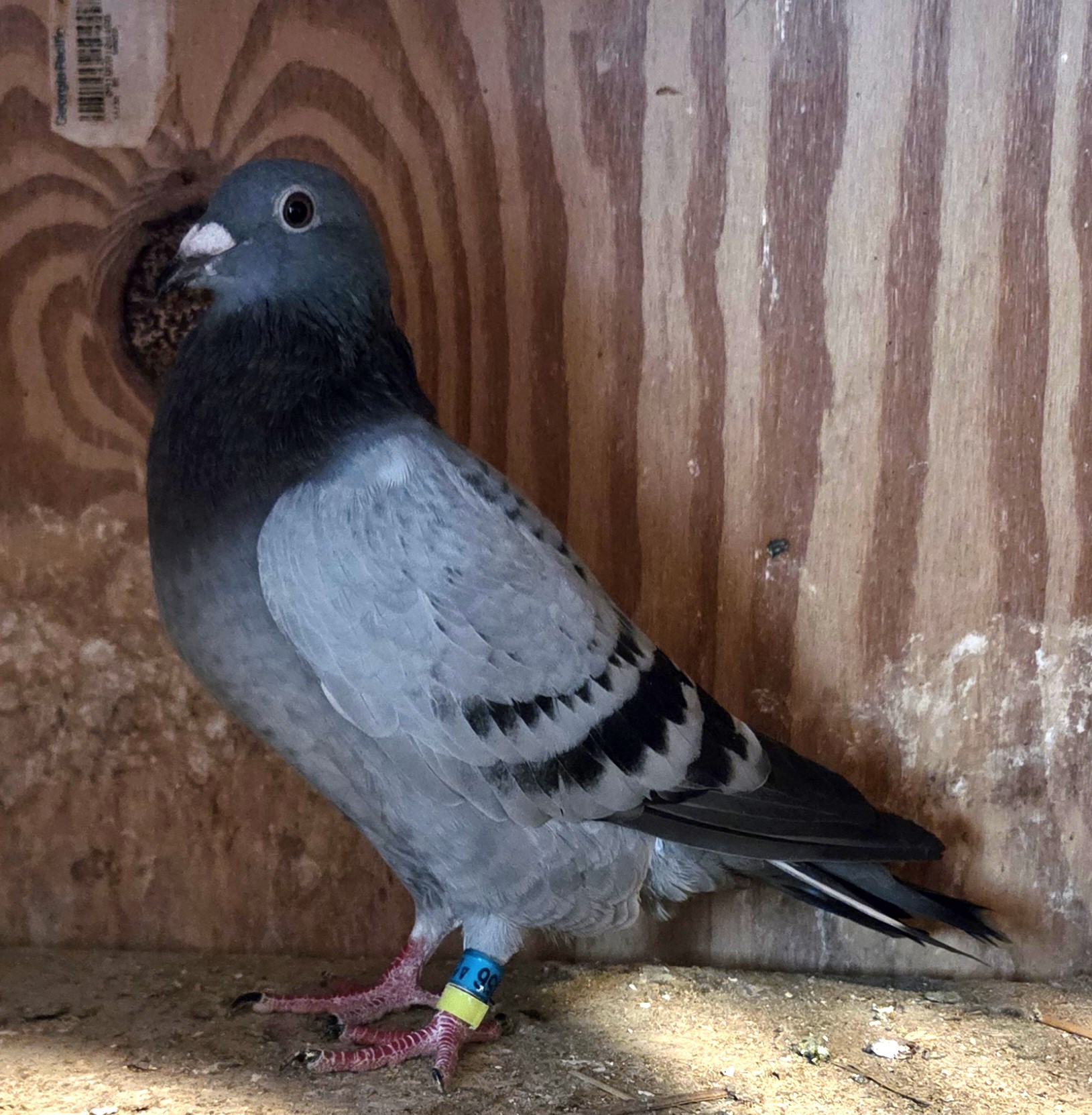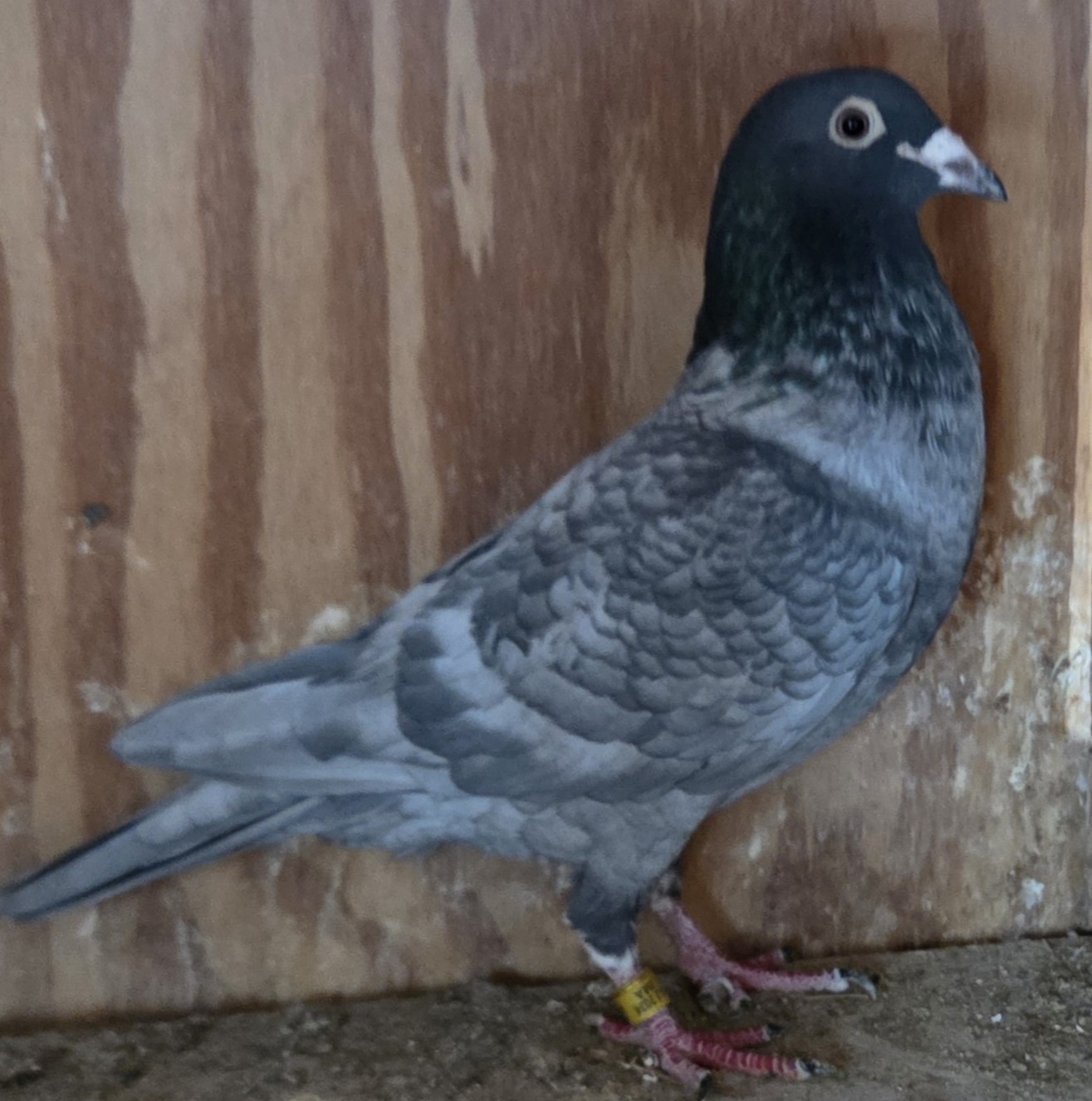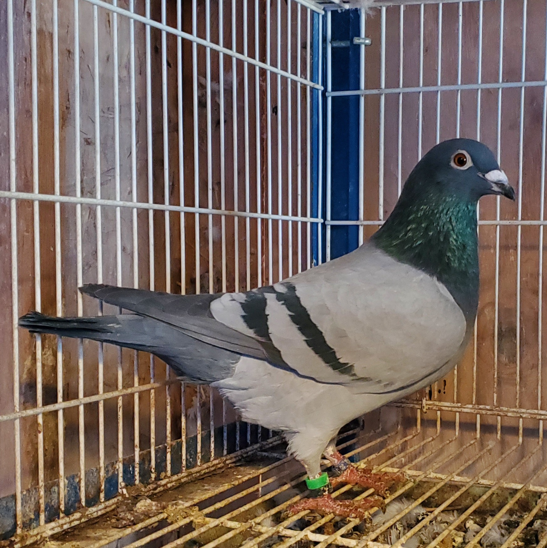 10. | 2023 grizzle cock no. 3676. This is the sire of the grizzle hen shown above in lot 2. He is a member of my flying team and has flown a total of 8 races out to 200 miles. (We are a small independent club and at this point we don't fly anything past 300 miles due to the expense and some years we don't even get that far.). He has a 2nd-place finish at 120 miles and has also been very productive as a breeder. I need to make room in both my racing and breeding lofts, as well as to cut down on total numbers of birds because as I get older it becomes more of a chore each year. 3676 is out of a pair of "white grizzles", so it would be reasonable (but not a foregone conclusion) to assume he is a homozygous grizzle, which means all his offspring whould be grizzle. His pedigree includes the old-line Wegges, long-distance Delbar and Janssen on the sire's side; and mostly Janssen on dam's side with a bit of Hofkens. Sire's background includes an AU Registered Champion as well as siblings of AU Elite Champions. Price: $100 | ![]() |