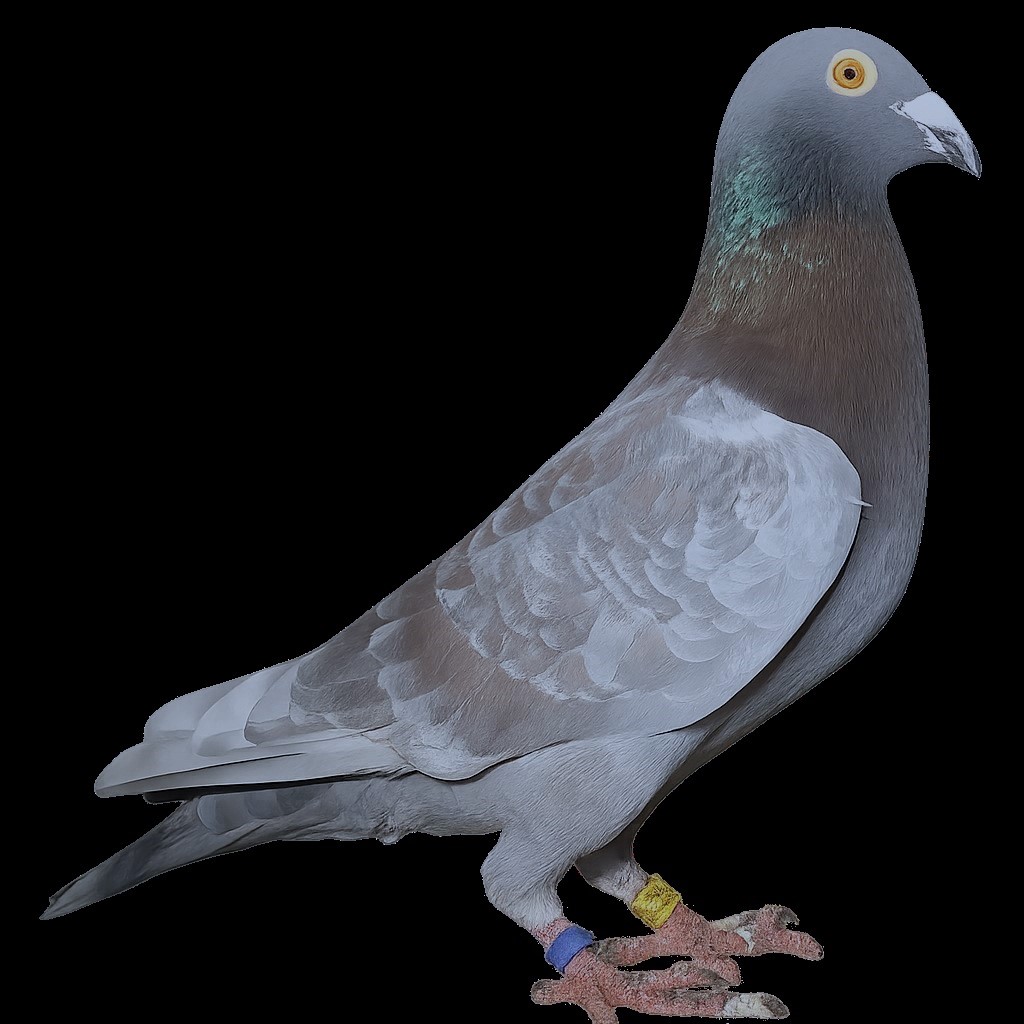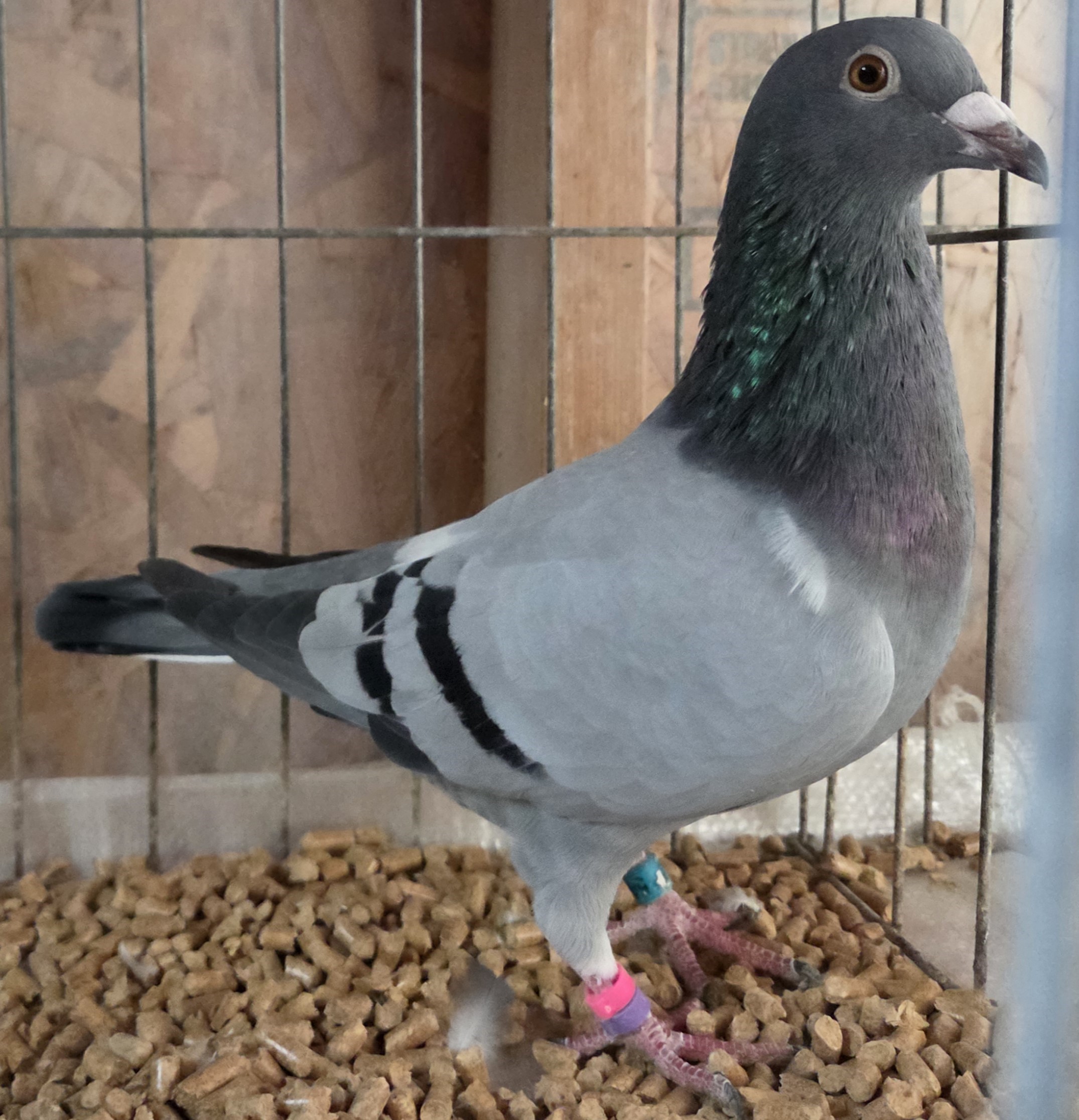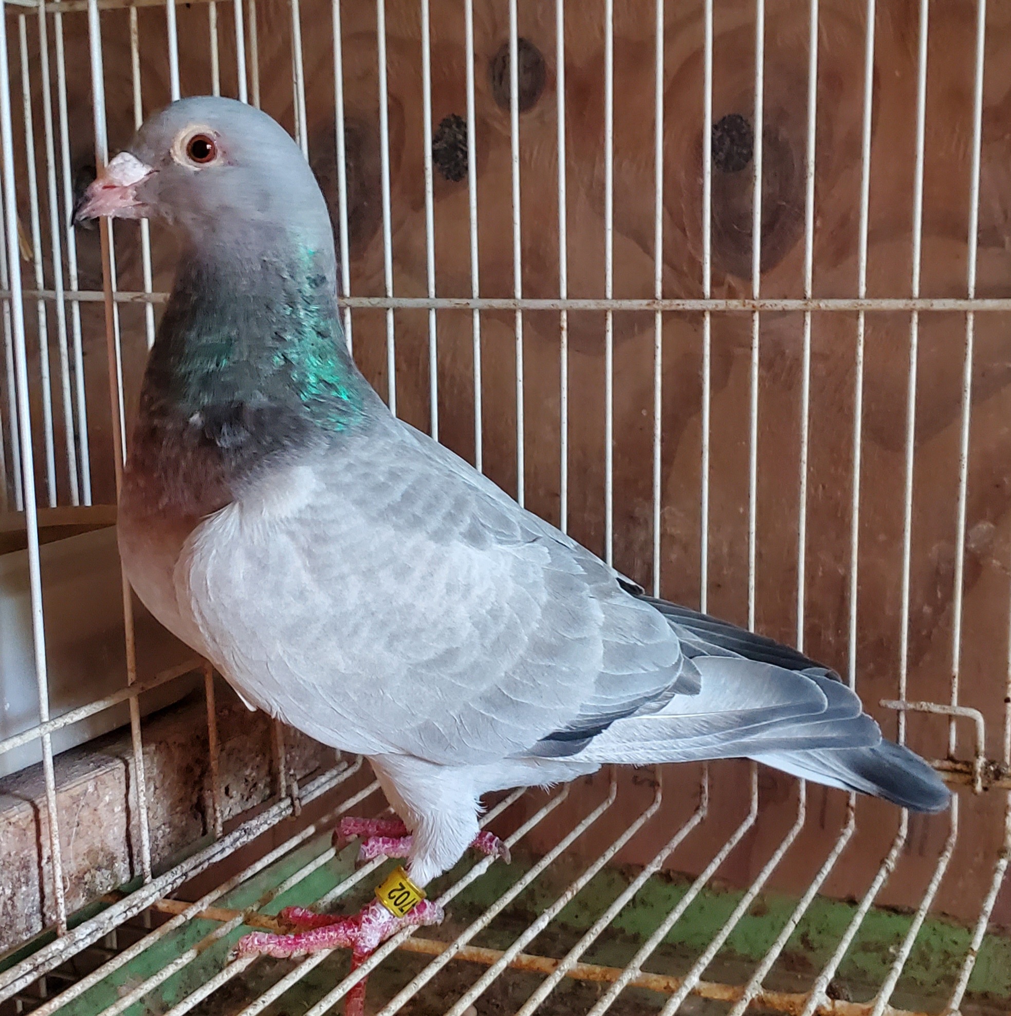 10. | 2023 grizzle cock no. 3676. This is the sire of the grizzle hen shown above in lot 2. He is a member of my flying team and has flown a total of 8 races out to 200 miles. (We are a small independent club and at this point we don't fly anything past 300 miles due to the expense and some years we don't even get that far.). He has a 2nd-place finish at 120 miles and has also been very productive as a breeder. I need to make room in both my racing and breeding lofts, as well as to cut down on total numbers of birds because as I get older it becomes more of a chore each year. 3676 is out of a pair of "white grizzles", so it would be reasonable (but not a foregone conclusion) to assume he is a homozygous grizzle, which means all his offspring whould be grizzle. His pedigree includes the old-line Wegges, long-distance Delbar and Janssen on the sire's side; and mostly Janssen on dam's side with a bit of Hofkens. Sire's background includes an AU Registered Champion as well as siblings of AU Elite Champions. Price: $100 | ![]() |