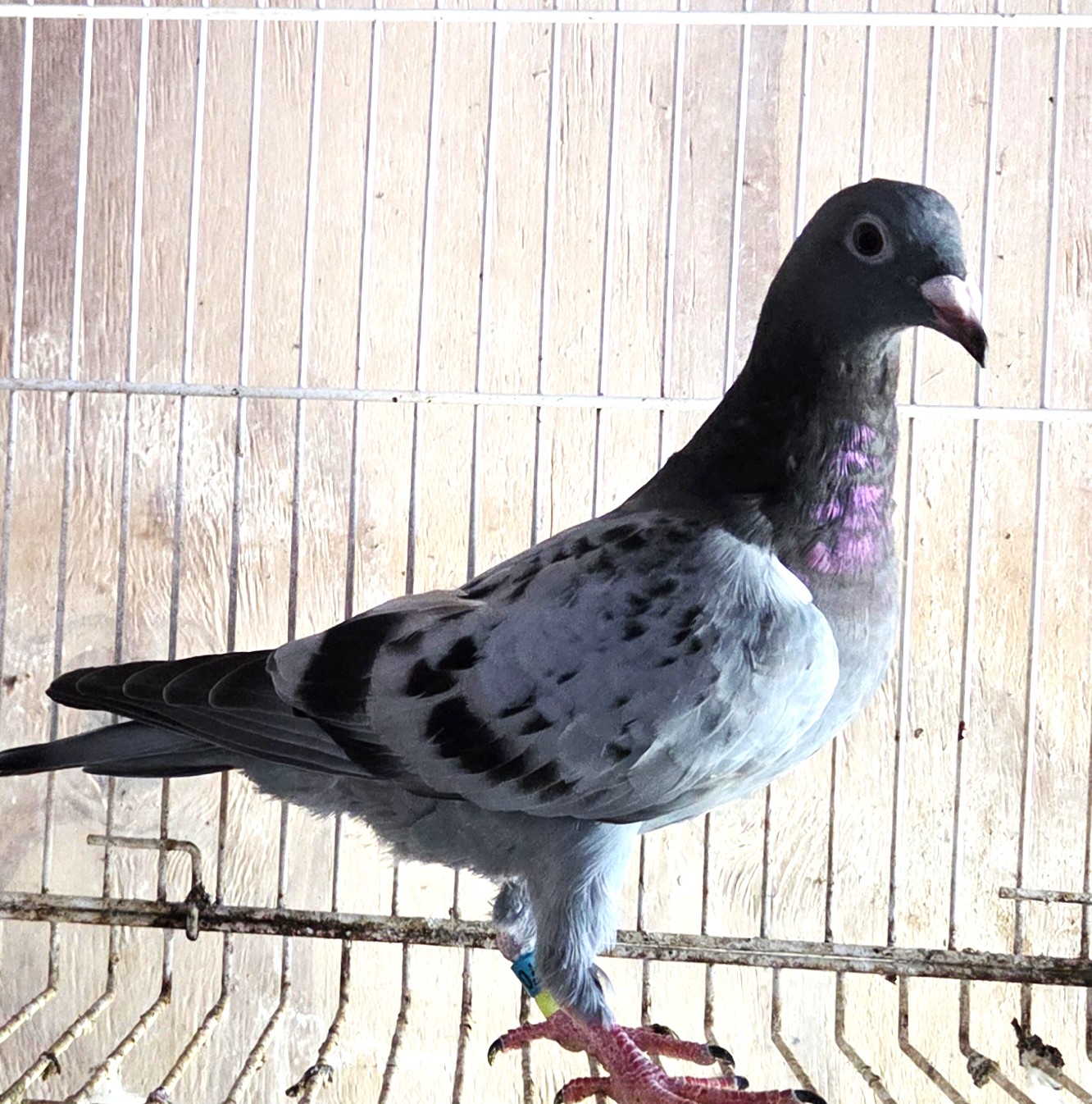 2. | May 2025 hatch grizzle no. 5425. This is a large pigeon, appears to be hen, but sex is not guaranteed. (I am about 85% confident she is indeed a hen, but still not sure.) She was bred from a pair of my flyers, a grizzle cock no. 3676 and a blue bar hen no. 3727. Sire has flown 8 races out to 200 miles and has a 2nd-place finish at 120. Dam has flown 9 races out to 200 miles. Sire's side is Janssen and long-distance Delbar; dam's parents are a pair of blue bars from the dispersal of the estate of the late Paul Anderson (PNA Loft) in Southern California. Paul was known as a very successful flyer there, especially in one-loft races, but also was quite successful in his own club. Full pedigree. Price: $75. |