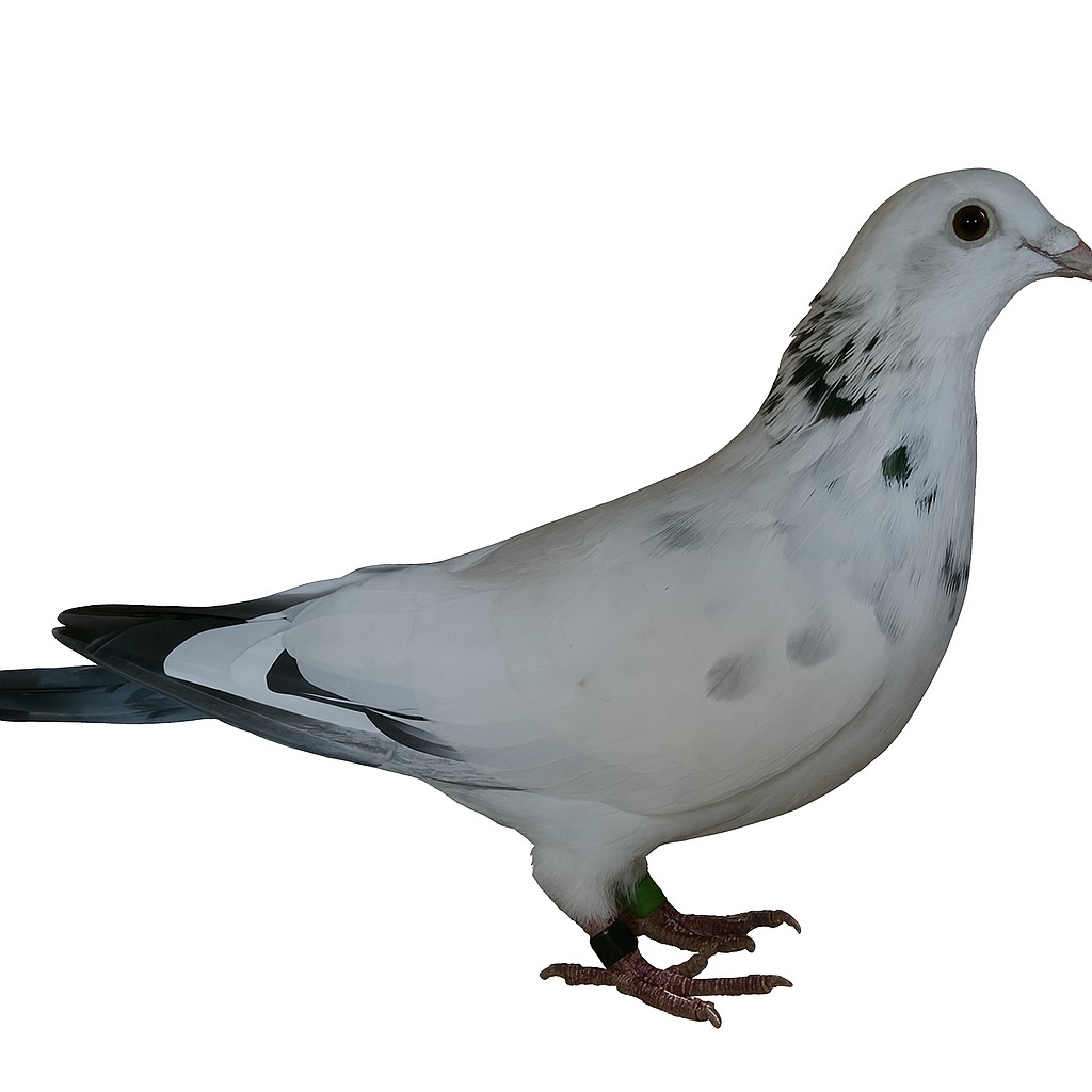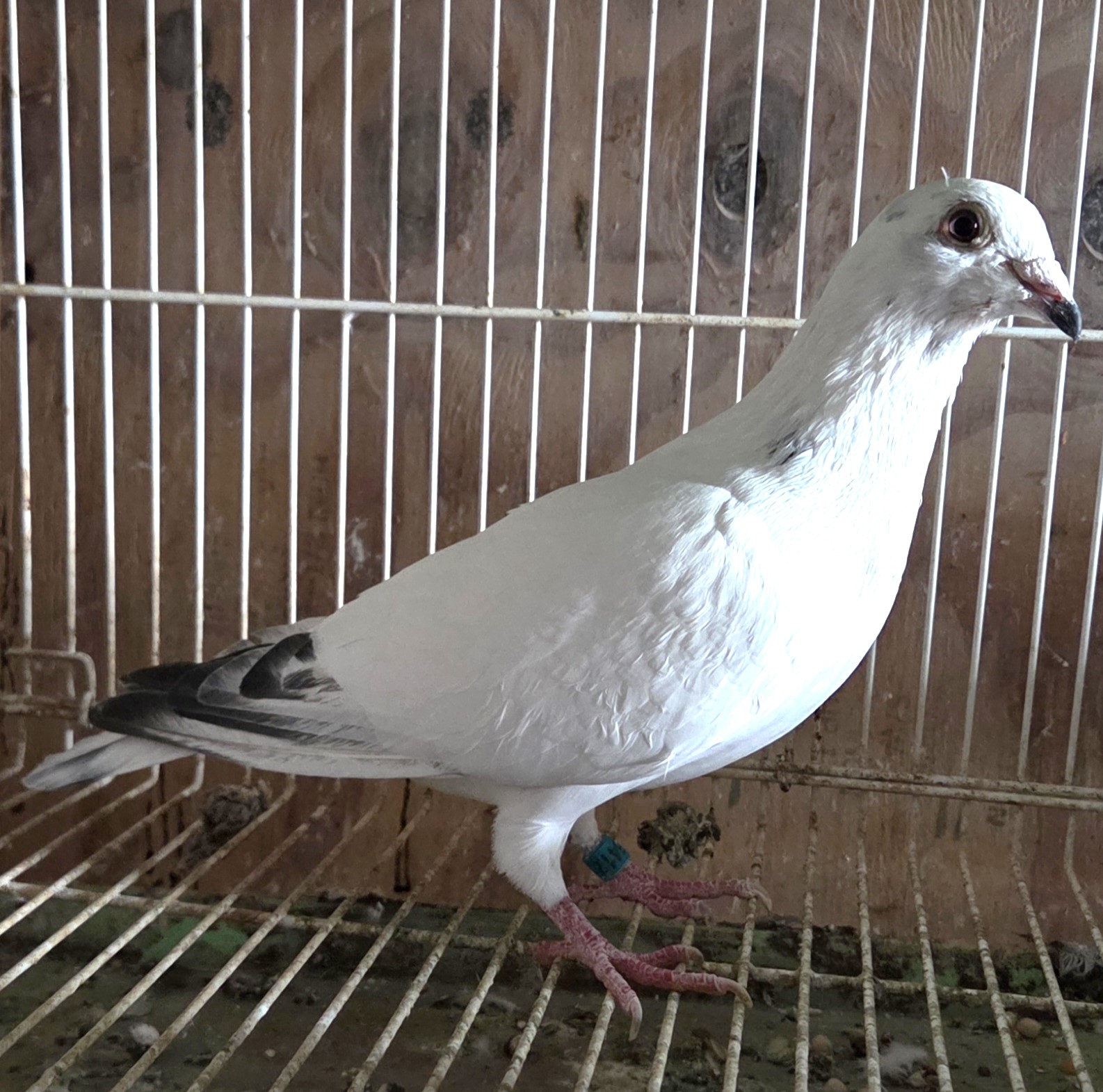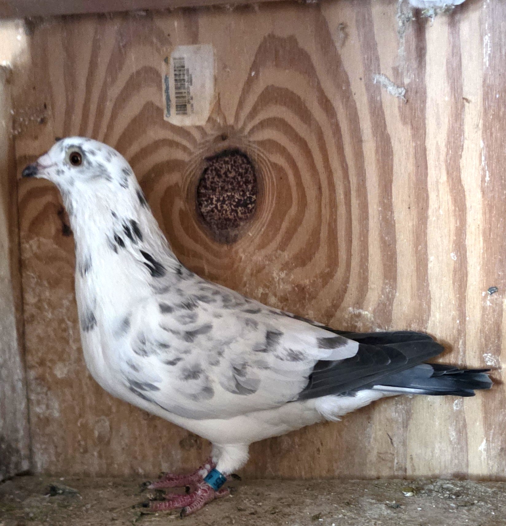 9. | May 2025 hatch white grizzle cock no. 5412. This is actually a homozygous (pure) grizzle which means all of his young will be some form of grizzle. He was weaned too late to put on the current YB team and was set aside in case I needed him for breeding. At this point it does not appear that I will need him since I will have both his parents. Both parents are on the current OB team. Sire has flown 4 races out to 200 miles and dam has flown twice from 100 and twice from 120. 5412 is a blend of Janssen, Delbar, HVR and Wegge. His paternal grandfather, a pure Wegge, has flown 20 races out to 350 miles. Fully pedigreed. Price: $100. | ![]() |